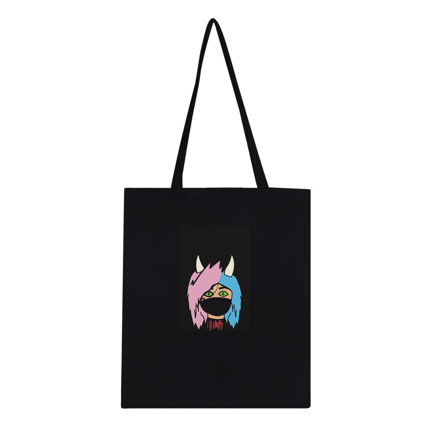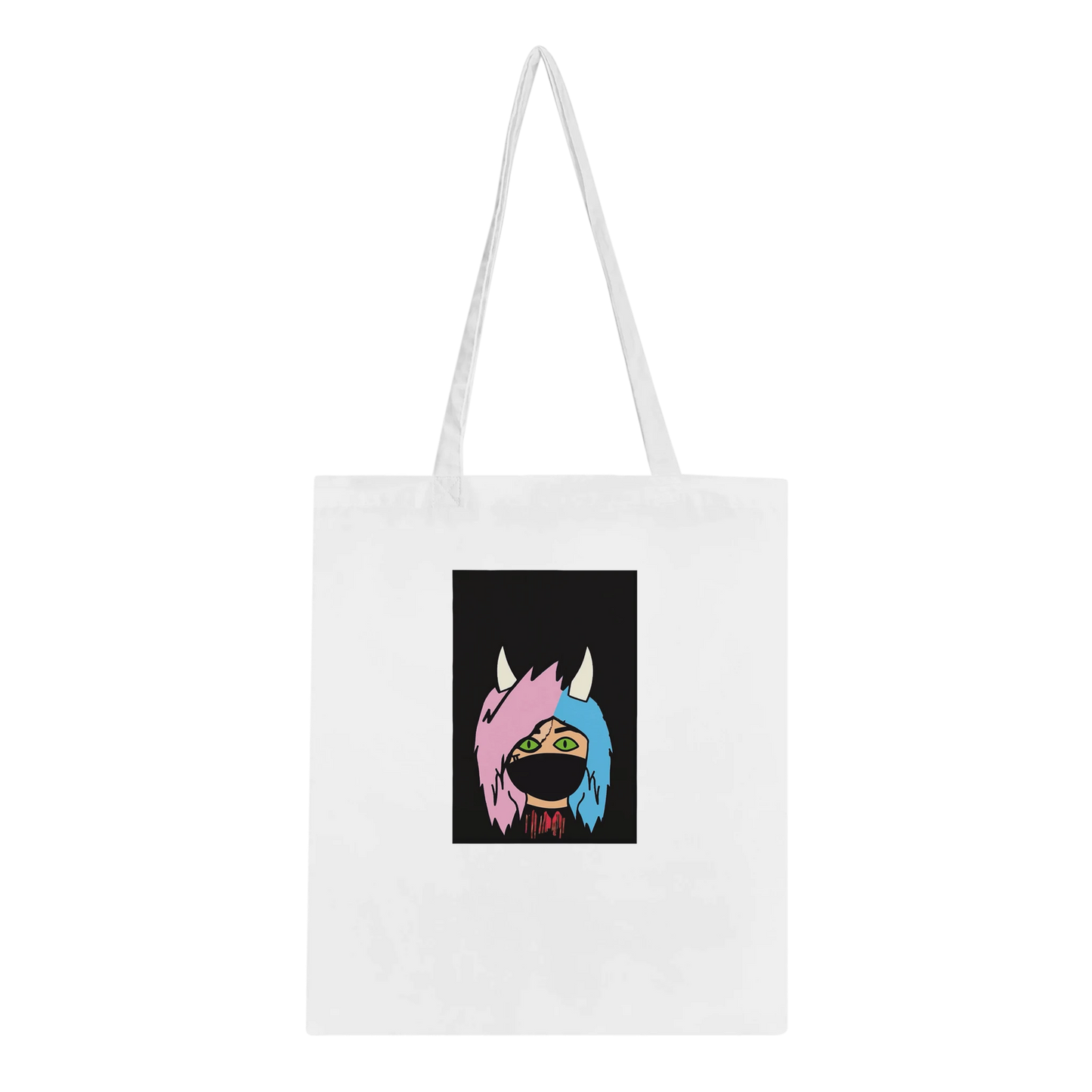 This tote bag has art by the artist bllack cat. Follow @bllackcat.m4a on Facebook and Instagram.