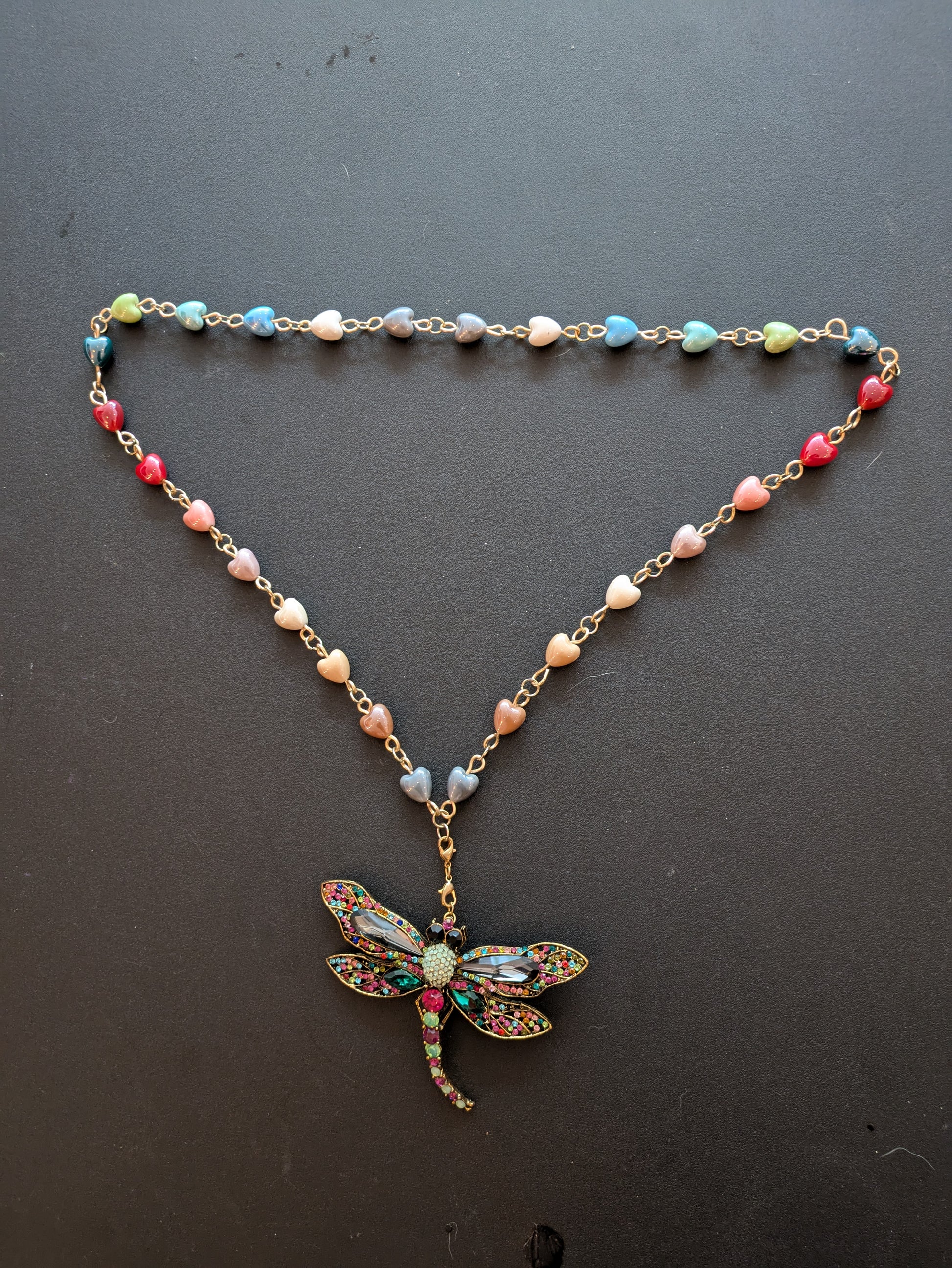 This necklace has glass rhinestones on the pendant, gold plated metal, brass metal, and ceramic heart wire links. The necklace doesn't have a clasp and slips right over your neck.