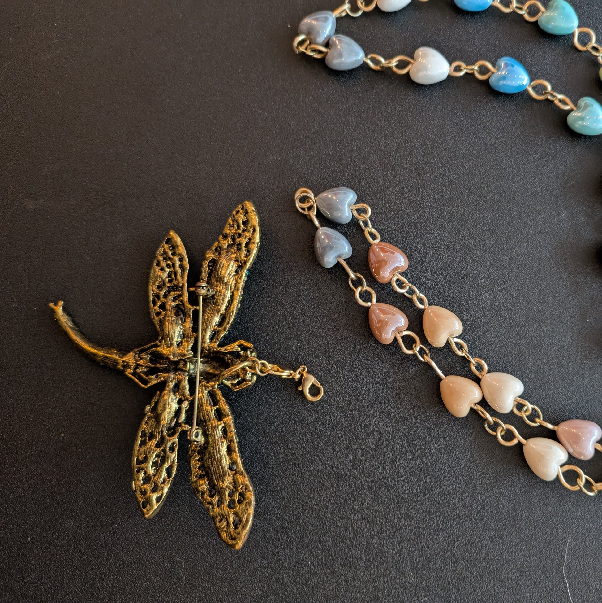 Gold Plated Brass Rhinestone Broach Pendant Ceramic Heart Wire Link Necklace